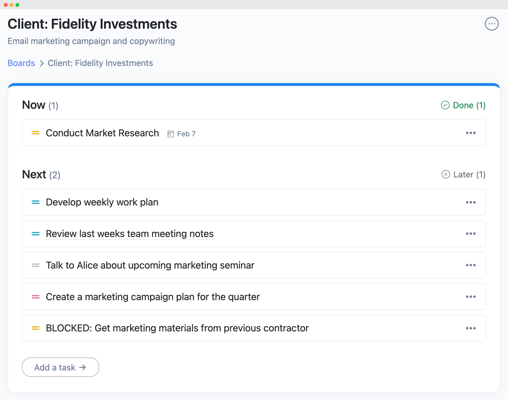 Boardly is about planning and executing your daily work in the simplest manner possible. You start by creating a board, choosing a color and adding a description. Then, you can start adding tasks to the Next bucket. The Now bucket is for tasks you intend to work on now. When you are done, you move the task into the Done bucket. If a task is not something you want to do now or next, move it to the Later bucket. You can invite others to collaborate on the board and make the board public to showcase progress. You can also keep meeting notes.